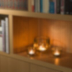Den starka geometriska formgivningen sätter ljuset i fokus då den ger fina skuggor. På detta sätt skapar den fin stämning var än den placeras. Jazz Mini är en ljuskälla avsedd för värmeljus. Den är tillverkad i mässing med insats av glas. Mässingen är lackerad och behöver ej putsas.