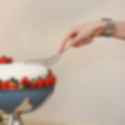 ”Jag tror att vi behöver det där extra lagret i tillvaron, när det glimmar till. När besticket blir som ett smycke på bordet och smakerna för oss till en annan plats. Inspirationen till Gondol kommer från en typisk svensk tårtspade och en thailändsk kökskniv. Tanken är att Gondols unika design och funktion ska förgylla måltiden då man skär och serverar till exempel en paj, gratäng eller tårta.”