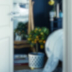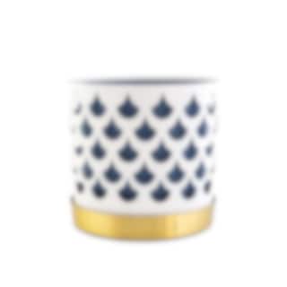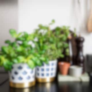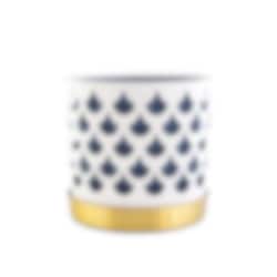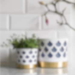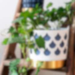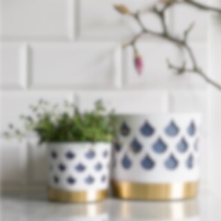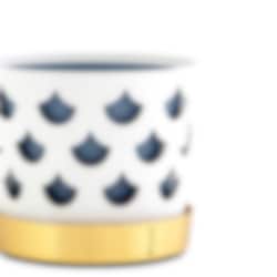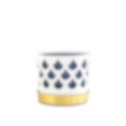 Det fina genombrutna mönstret till blomkrukorna skapar fint djup och ger karaktär utan att ta uppmärksamhet från växten. Varje kruka har tre delar; innerkruka, ytterkruka samt fat. Krukorna är tillverkade i rostfritt stål och sedan varsamt lackerade för en matt porslinsaktig yta. Fatet är tillverkat i borstad mässing.