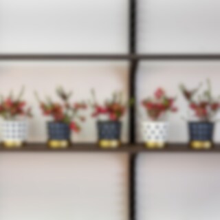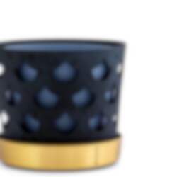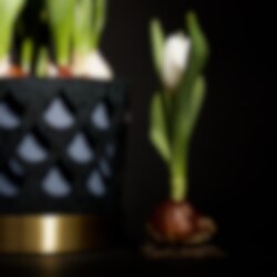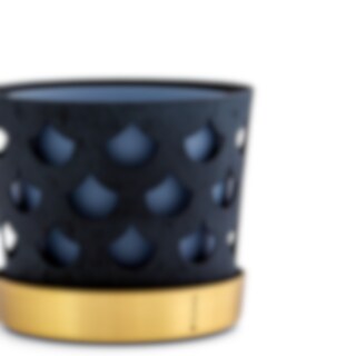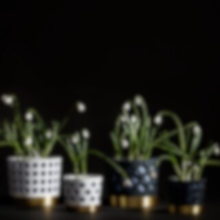 Det fina genombrutna mönstret till blomkrukorna skapar fint djup och ger karaktär utan att ta uppmärksamhet från växten. Varje kruka har tre delar; innerkruka, ytterkruka samt fat. Krukorna är tillverkade i rostfritt stål och sedan varsamt lackerade för en matt porslinsaktig yta. Fatet är tillverkat i borstad mässing.