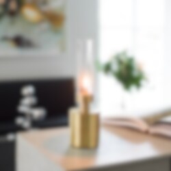Lampan är tillverkad i mässing och finns också pulverlackerad i grått eller svart samt med kopparyta. Koppar- och mässingslamporna får en fin patina med tiden om de inte putsas. Oljelampan fylls med lampolja av god kvalité.