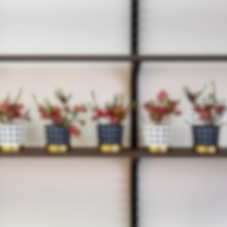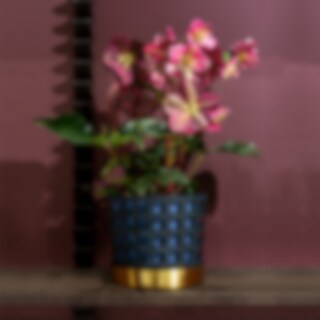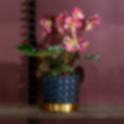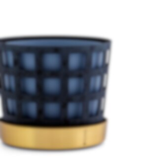 Det fina genombrutna mönstret till blomkrukorna skapar fint djup och ger karaktär utan att ta uppmärksamhet från växten. Varje kruka har tre delar; innerkruka, ytterkruka samt fat. Krukorna är tillverkade i rostfritt stål och sedan varsamt lackerade för en matt porslinsaktig yta. Fatet är tillverkat i borstad mässing.